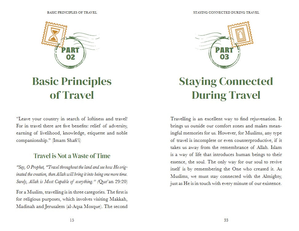 • Practical Spiritual Tips – Includes guidance on salah during travel, packing with purpose, halal choices, dhikr journaling, and mindful observation.