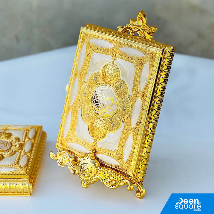 This elegant Metal Quran Box with Stand is designed to hold a Quran size of 14x20 cm (Medium), ensuring it remains protected and well-preserved. Crafted from high-quality metal and adorned with shimmering rhinestones on the front, this decorative piece is both functional and visually stunning. The beautifully crafted stand adds an extra touch of sophistication, making it an ideal addition to your home décor.