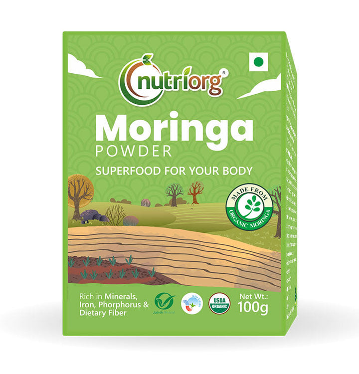 Nutriorg Certified Organic Moringa Powder is made from moringa leaf cultivated in certified organic farmlands. It is an excellent source of vitamin A, vitamin C, vitamin E, and bioflavonoids. These nutrients help in blocking the oxidation of healthy tissues by active oxygen, thus delaying the ageing process and reducing the appearance of fine lines and wrinkles. Moringa powder contains all the essential nutrients, vitamins, and minerals conducive to healthy hair. It is loaded with high contents of vitamins E and C.