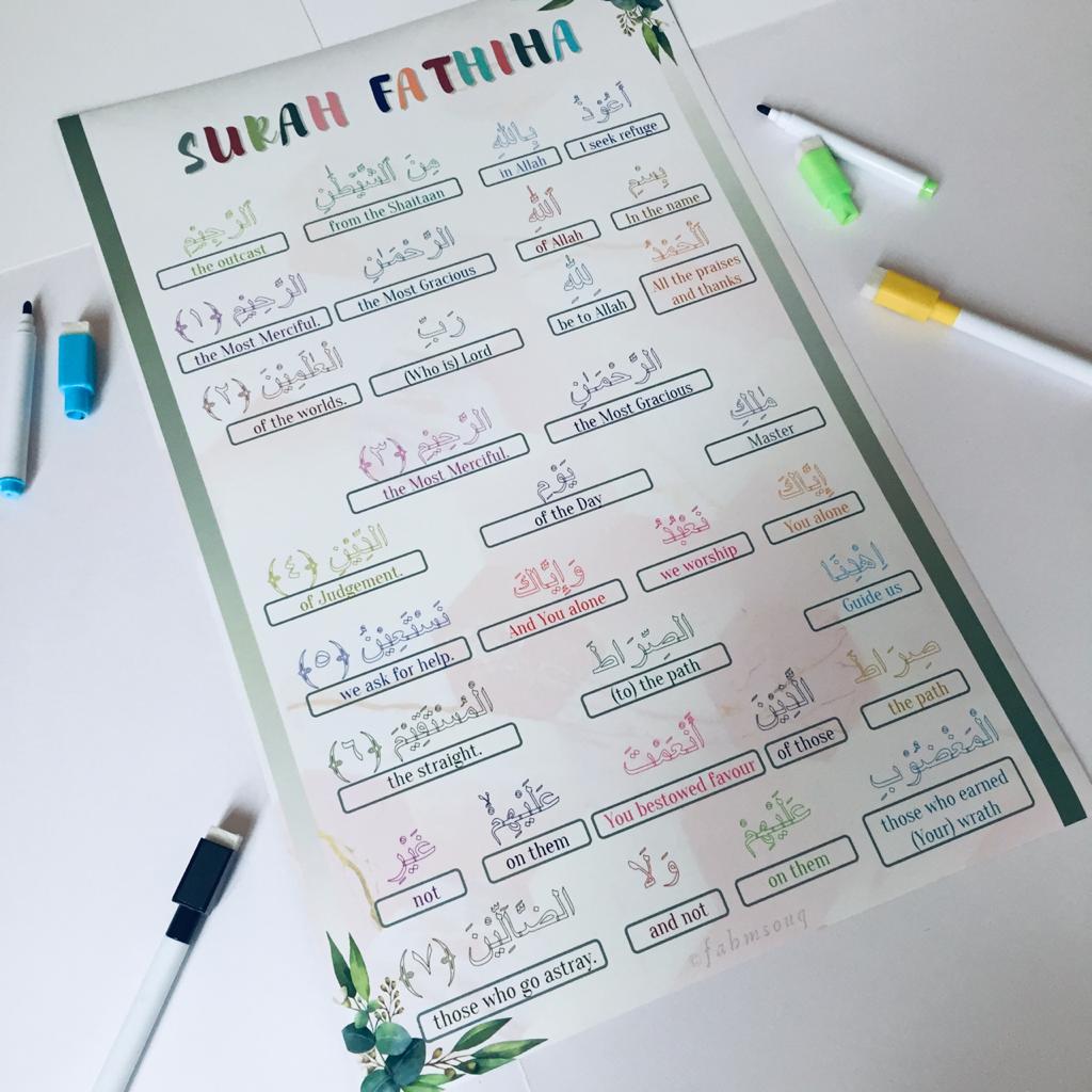This WORD FOR WORD SURAH FATHIHA WRITE AND ERASE MAGNETIC POSTER helps children understand each word, aids in boosting their Qur’anic vocabulary and helps in improving their attention during daily five prayers in shaa Allah.