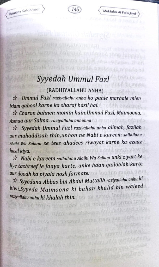 Is bunyaad par zaroori hai ke in ki seerat ka mutala‘ah kiya jaaye ,zere nazar Sahabiyaat ke eiman afroz tazkire par mushtamil aik azeem kitab hai jo khawateen ki seerat aur eiman w amal ki ta'meer mein zabardast kirdar ada kar sakti hai. Isi baat ko malhooz rakhte huye "Maktabah Al Faizi" Hyderabad ise Roman mein pesh karne jaa raha hai, taake urdu na aashna tabqa e niswan is kitab se mustafeed ho sake.