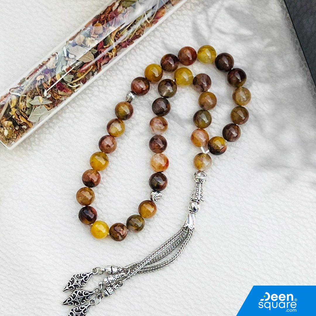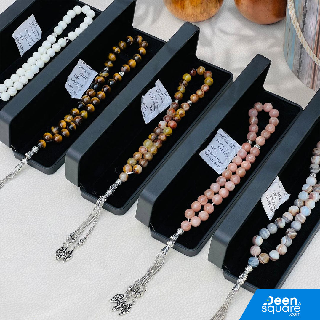 Experience the beauty and spiritual depth of our Pearl 33 Beads Tasbeeh made from natural Chalcedony in a warm brown hue. Each bead is carefully polished, reflecting the unique characteristics of this semi-precious stone, known for its calming and grounding properties. This tasbih is not only a perfect companion for daily dhikr (remembrance of Allah) but also a symbol of spiritual harmony and elegance.