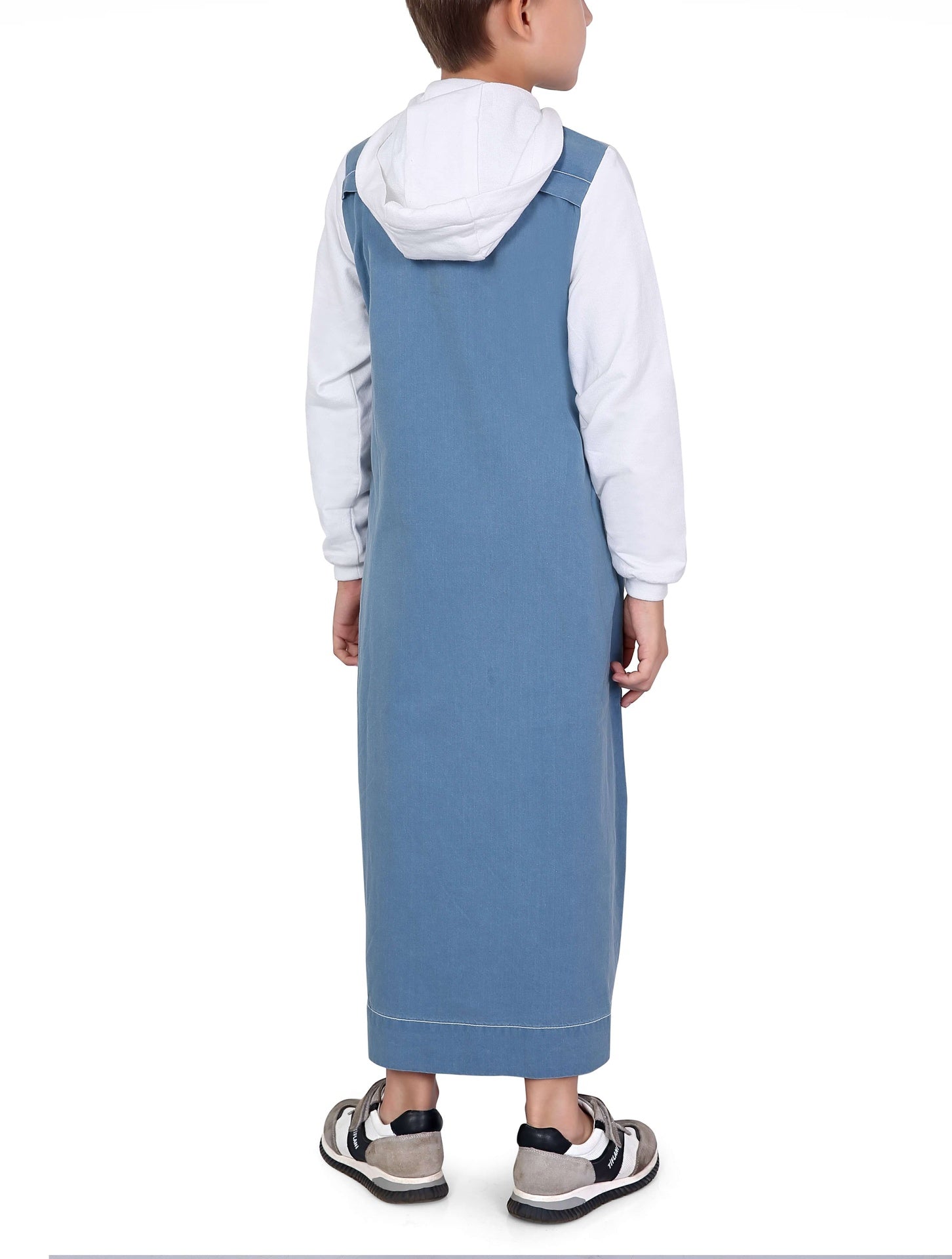 "" Introducing our unique and stylish denim thobe with a twist! This thobe is a perfect blend of modern fashion and traditional Arabic style, designed to make you stand out from the crowd. Crafted from high-quality washed sky blue denim, this thobe is both comfortable and durable, perfect for everyday wear. The knitted t-shirt fabric on the hoody and drawstring add a touch of luxury and comfort, making it the perfect choice for any occasion. The front zipper makes it easy to wear and remove, while the hoody and drawstring give it a modern twist. This denim thobe also features two pockets for added convenience. Whether you're looking for a unique and stylish thobe for a casual outing or a formal occasion, this denim thobe is sure to impress. Its blend of modern fashion and traditional Arabic style make it the perfect addition to your wardrobe. Order yours today and experience the perfect combination of comfort and style!"